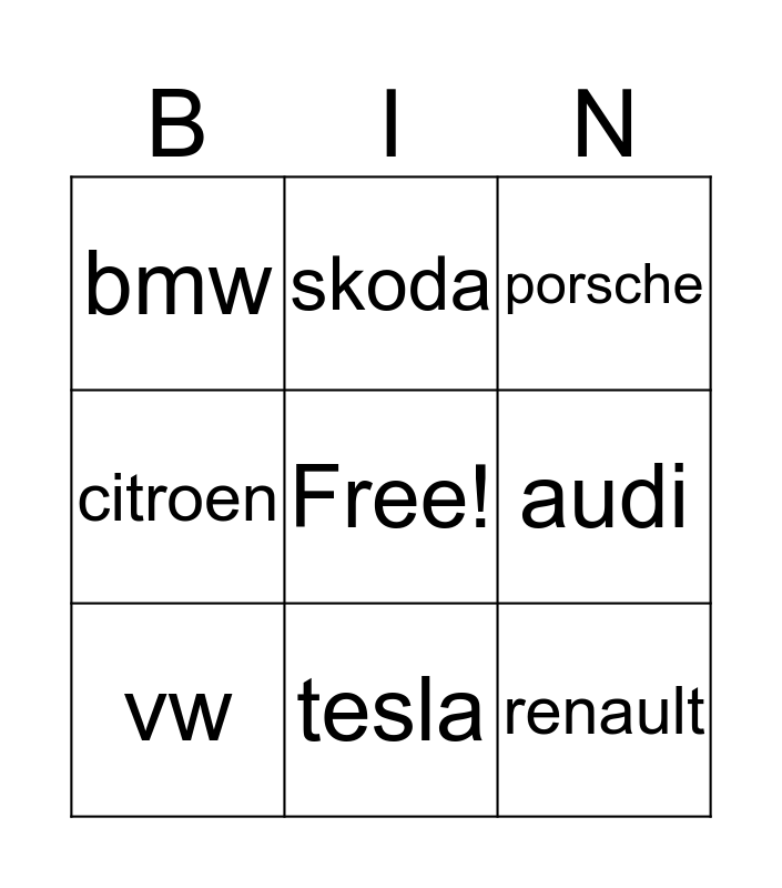 This bingo card has a free space and 8 words: audi, porsche, skoda, vw, bmw, renault, citroen and tesla.