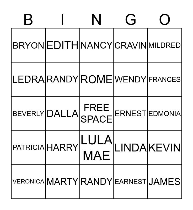 This bingo card has a free space and 24 words: HARRY, MARTY, ROME, VERONICA, MILDRED, BRYON, LEDRA, EDITH, ERNEST, LULA MAE, WENDY, BEVERLY, LINDA, KEVIN, RANDY, EARNEST, EDMONIA, NANCY, FRANCES, DALLA, JAMES, PATRICIA, CRAVIN and RANDY.