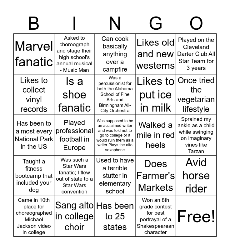 This bingo card has 33 words: Free!, Spent a year in France during sophomore year of high school, Played professional football in Europe, Ran three marathons, Likes to garden, Taught a fitness bootcamp that included your dog, Is a shoe fanatic, Played on the Cleveland Darter Club All Star Team for 3 years, Came in 10th place for choreographed Michael Jackson video in college, Asked to choreograph and stage their high school's annual musical - Music Man, Didn't get drivers license until 20 years old, Was a percussionist for both the Alabama School of Fine Arts and Birmingham All-City Orchestra, Can cook basically anything over a campfire, Plays USDA tennis, Back in the day, had cool moves on the dance floor, Walked a mile in red heels, Once tried the vegetarian lifestyle, Sang alto in college choir, Has been to almost every National Park in the US, Was such a Star Wars fanatic; I flew out of state to a Star Wars convention, Does Farmer's Markets, Used to have a terrible stutter in elementary school, Loves to travel and has been to 23 countries, Marvel fanatic, Sprained my ankle as a child while swinging on imaginary vines like Tarzan, Has been to 25 states, Was supposed to be an acclaimed writer and was told not to go to college or it would ruin them as a writer Plays the alto saxophone, Likes old and new westerns, Likes to put ice in milk, Likes to collect vinyl records, Avid horse rider, Was asked by Wayne Newton to work with him in Vegas, Won an 8th grade contest for best portrayal of a Shakespearean character and Hopes to one day compete in the July 4th Nathan's Hot Dog Eating Contest on Conney Island.