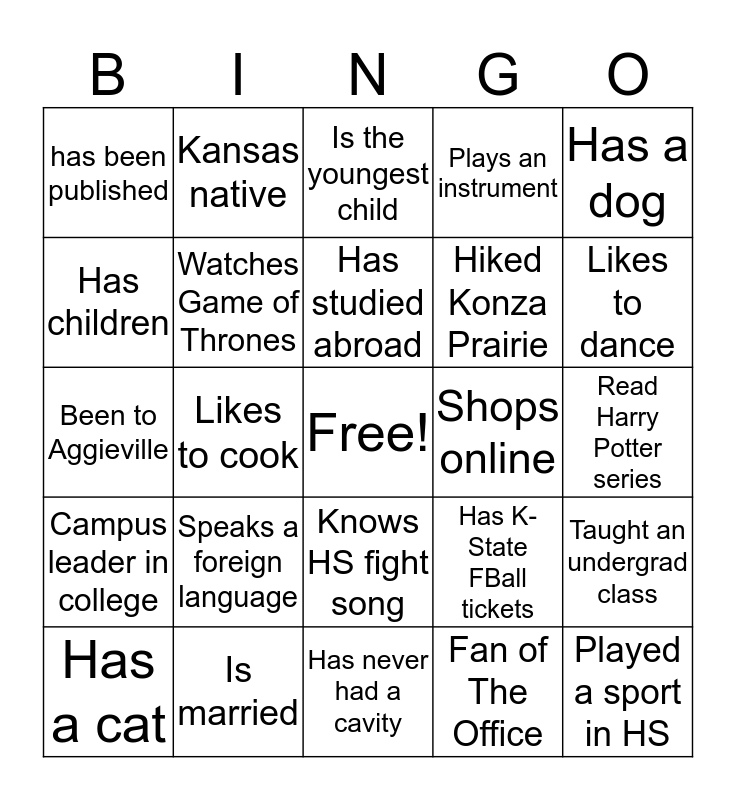 This bingo card has a free space and 24 words: Speaks a foreign language, Is married, Has studied abroad, Has a cat, Has a dog, has been published, Has children, Kansas native, Shops online, Knows HS fight song, Hiked Konza Prairie, Been to Aggieville, Has K-State FBall tickets, Taught an undergrad class, Watches Game of Thrones, Fan of The Office, Read Harry Potter series, Is the youngest child, Likes to dance, Likes to cook, Played a sport in HS, Campus leader in college, Plays an instrument and Has never had a cavity.