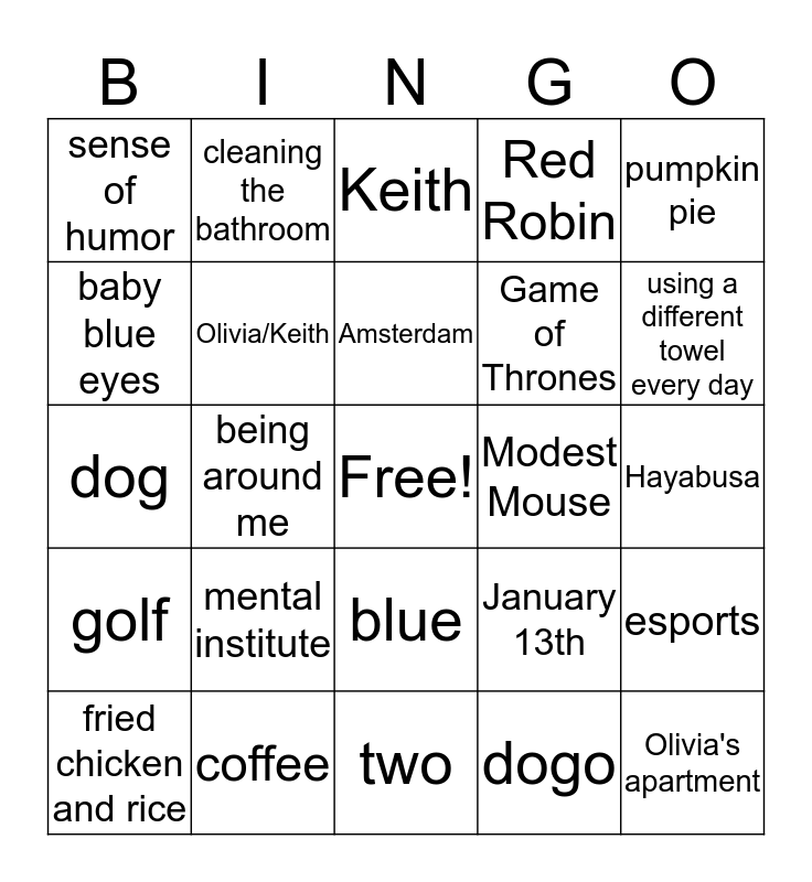 This bingo card has a free space and 24 words: mental institute, coffee, Amsterdam, fried chicken and rice, pumpkin pie, sense of humor, baby blue eyes, cleaning the bathroom, Modest Mouse, blue, Game of Thrones, dog, January 13th, esports, Olivia/Keith, dogo, Hayabusa, Keith, using a different towel every day, being around me, Olivia's apartment, golf, Red Robin and two.