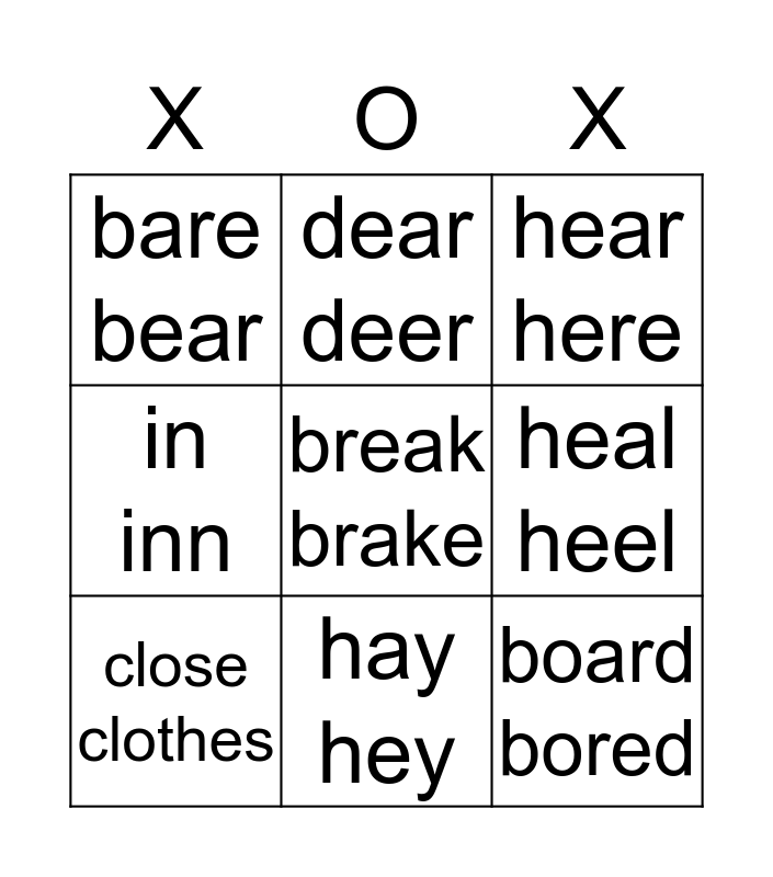 This bingo card has a free space and 8 words: heal heel, hear here, dear deer, close clothes, bare bear, board bored, in inn and hay hey.