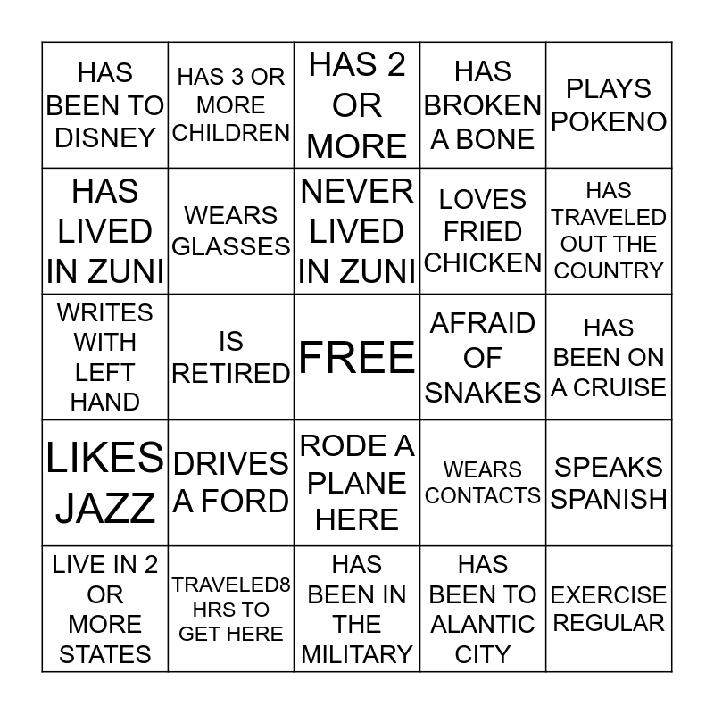 This bingo card has a free space and 24 words: DRIVES A FORD, TRAVELED8 HRS TO GET HERE, NEVER LIVED IN ZUNI, LIVE IN 2 OR MORE STATES, PLAYS POKENO, HAS BEEN TO DISNEY, HAS LIVED IN ZUNI, HAS 3 OR MORE CHILDREN, AFRAID OF SNAKES, RODE A PLANE HERE, LOVES FRIED CHICKEN, WRITES WITH LEFT HAND, WEARS CONTACTS, SPEAKS SPANISH, WEARS GLASSES, HAS BEEN TO ALANTIC CITY, HAS BEEN ON A CRUISE, HAS 2 OR MORE, HAS TRAVELED OUT THE COUNTRY, IS RETIRED, EXERCISE REGULAR, LIKES JAZZ, HAS BROKEN A BONE and HAS BEEN IN THE MILITARY.