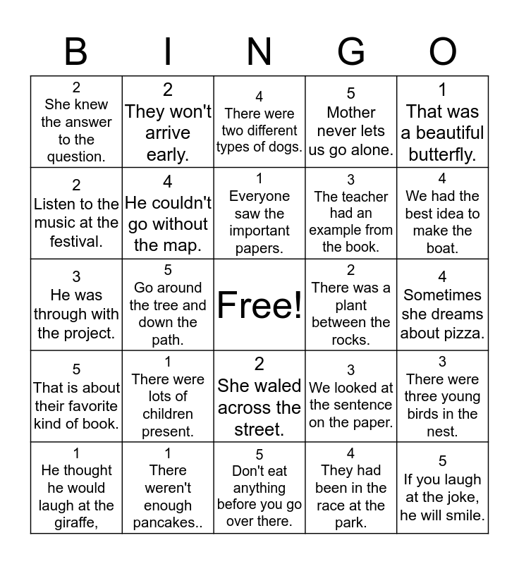 This bingo card has a free space and 24 words: 1 There were lots of children present., 1 There weren't enough pancakes.., 1 Everyone saw the important papers., 1 He thought he would laugh at the giraffe,, 1 That was a beautiful butterfly., 2 She knew the answer to the question., 2 Listen to the music at the festival., 2 They won't arrive early., 2 There was a plant between the rocks., 2 She waled across the street., 3 The teacher had an example from the book., 3 He was through with the project., 3 We looked at the sentence on the paper., 3 There were three young birds in the nest., 4 He couldn't go without the map., 4 They had been in the race at the park., 4 Sometimes she dreams about pizza., 4 There were two different types of dogs., 4 We had the best idea to make the boat., 5 Go around the tree and down the path., 5 If you laugh at the joke, he will smile., 5 That is about their favorite kind of book., 5 Mother never lets us go alone. and 5 Don't eat anything before you go over there..