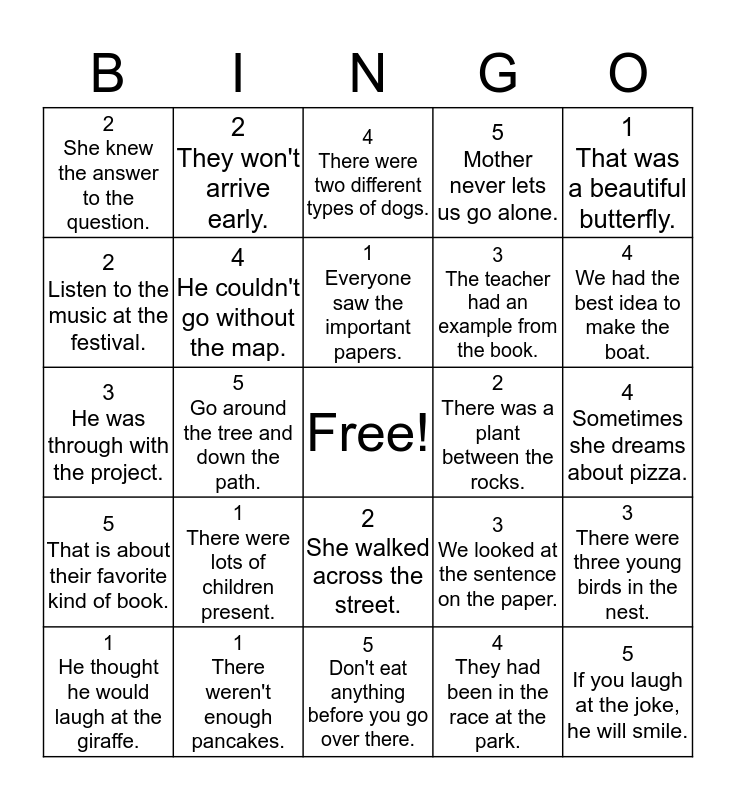 This bingo card has a free space and 24 words: 1 There were lots of children present., 1 There weren't enough pancakes., 1 Everyone saw the important papers., 1 He thought he would laugh at the giraffe., 1 That was a beautiful butterfly., 2 She knew the answer to the question., 2 Listen to the music at the festival., 2 They won't arrive early., 2 There was a plant between the rocks., 2 She walked across the street., 3 The teacher had an example from the book., 3 He was through with the project., 3 We looked at the sentence on the paper., 3 There were three young birds in the nest., 4 He couldn't go without the map., 4 They had been in the race at the park., 4 Sometimes she dreams about pizza., 4 There were two different types of dogs., 4 We had the best idea to make the boat., 5 Go around the tree and down the path., 5 If you laugh at the joke, he will smile., 5 That is about their favorite kind of book., 5 Mother never lets us go alone. and 5 Don't eat anything before you go over there..