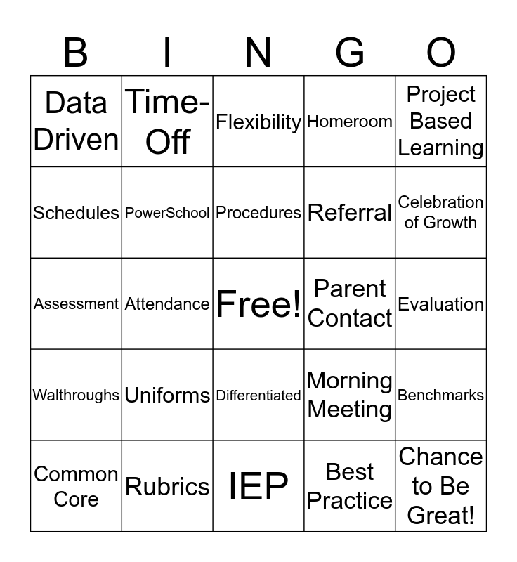 This bingo card has a free space and 24 words: Uniforms, Rubrics, Procedures, Common Core, Project Based Learning, Data Driven, Schedules, Time-Off, Parent Contact, Differentiated, Referral, Assessment, Morning Meeting, Benchmarks, PowerSchool, Best Practice, Evaluation, Flexibility, Celebration of Growth, Attendance, Chance to Be Great!, Walthroughs, Homeroom and IEP.