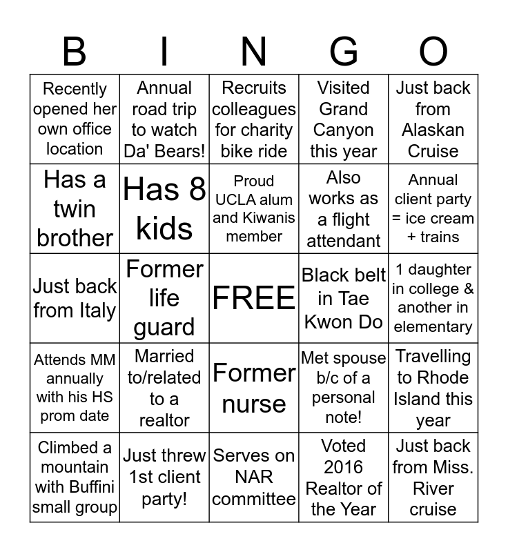 This bingo card has a free space and 24 words: Married to/related to a realtor, Just threw 1st client party!, Proud UCLA alum and Kiwanis member, Climbed a mountain with Buffini small group, Just back from Alaskan Cruise, Recently opened her own office location, Has a twin brother, Annual road trip to watch Da' Bears!, Black belt in Tae Kwon Do, Former nurse, Also works as a flight attendant, Just back from Italy, Met spouse b/c of a personal note!, Travelling to Rhode Island this year, Has 8 kids, Voted 2016 Realtor of the Year, 1 daughter in college & another in elementary, Recruits colleagues for charity bike ride, Annual client party = ice cream + trains, Former life guard, Just back from Miss. River cruise, Attends MM annually with his HS prom date, Visited Grand Canyon this year and Serves on NAR committee.
