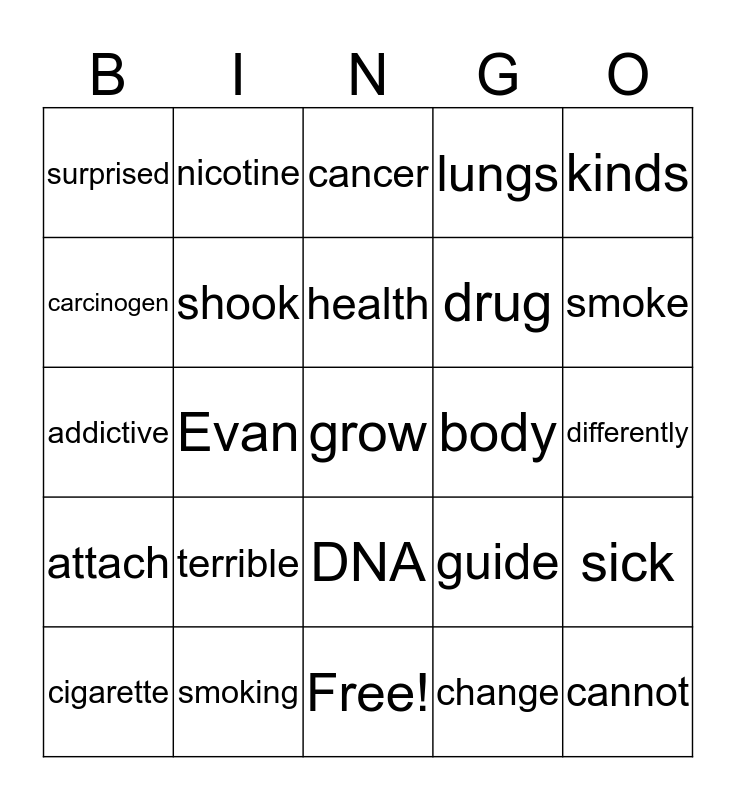This bingo card has 31 words: Free!, Kevin, Evan, notes, surprised, cancer, shook, guide, body, change, differently, grow, cannot, use, smoke, get, sick, terrible, attach, DNA, kinds, danger, cigarette, nicotine, drug, carcinogen, lungs, addictive, smoking, health and homework.