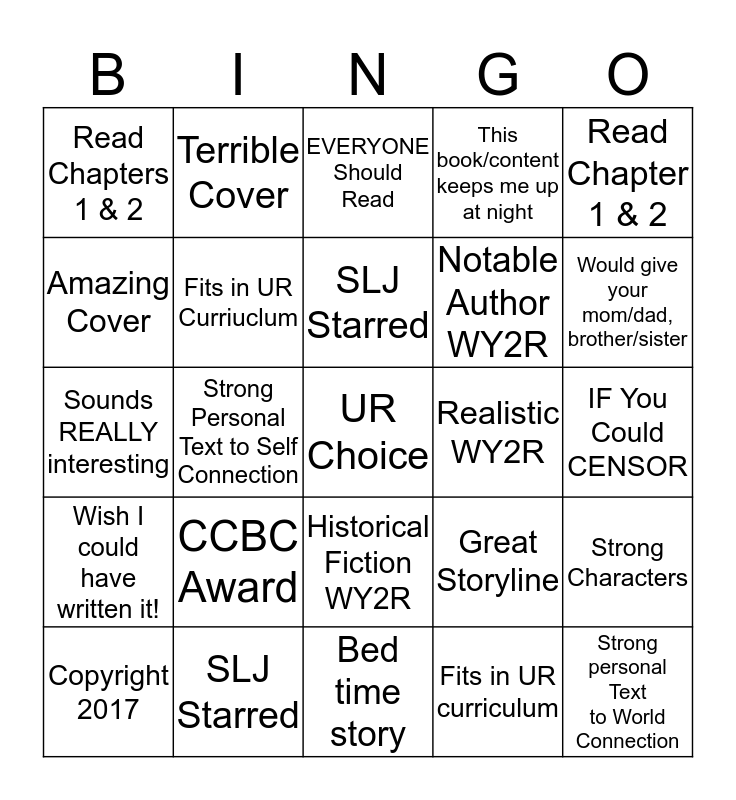 This bingo card has a free space and 24 words: CCBC Award, SLJ Starred, SLJ Starred, Copyright 2017, Read Chapter 1 & 2, Read Chapters 1 & 2, Amazing Cover, Terrible Cover, Realistic WY2R, Historical Fiction WY2R, Notable Author WY2R, Sounds REALLY interesting, Great Storyline, Strong Characters, Fits in UR Curriuclum, Fits in UR curriculum, IF You Could CENSOR, EVERYONE Should Read, Would give your mom/dad, brother/sister, Strong Personal Text to Self Connection, Strong personal Text to World Connection, Wish I could have written it!, This book/content keeps me up at night and Bed time story.