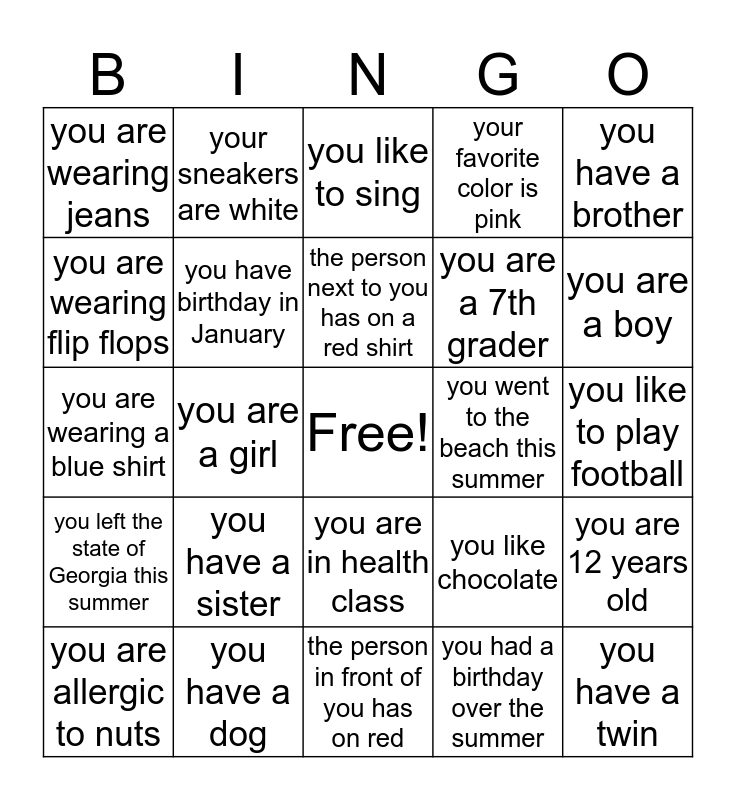 This bingo card has a free space and 24 words: you have a sister, you have a dog, the person next to you has on a red shirt, you are allergic to nuts, you have a brother, you are wearing jeans, you are wearing flip flops, your sneakers are white, you went to the beach this summer, you are in health class, you are a 7th grader, you are wearing a blue shirt, you like chocolate, you are 12 years old, you have birthday in January, you had a birthday over the summer, you like to play football, you like to sing, you are a boy, you are a girl, you have a twin, you left the state of Georgia this summer, your favorite color is pink and the person in front of you has on red.
