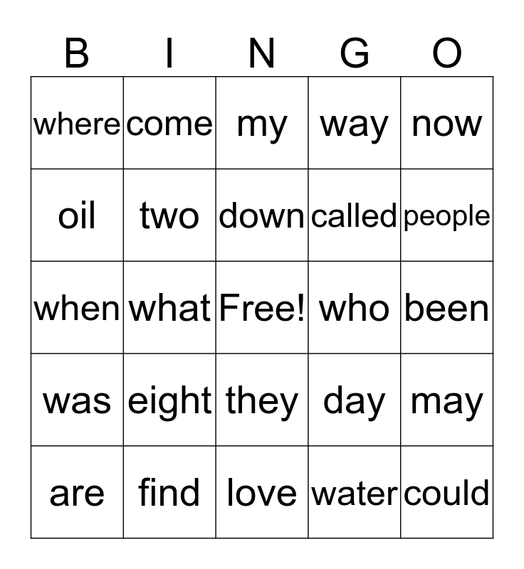This bingo card has a free space and 24 words: eight, find, down, are, now, where, oil, come, who, they, called, when, day, may, two, water, been, my, people, what, could, was, way and love.