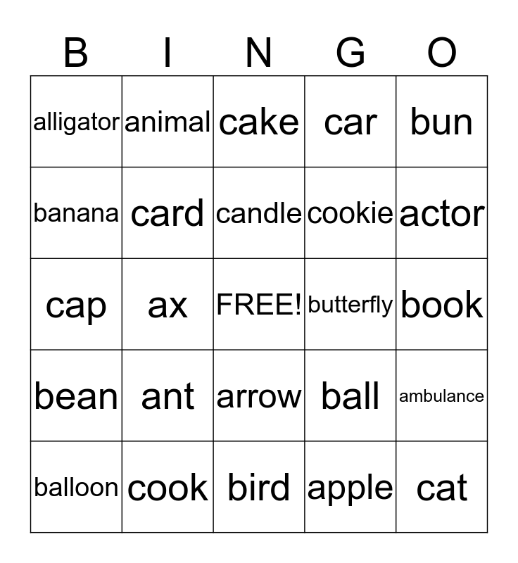 This bingo card has a free space and 24 words: ant, cook, candle, balloon, bun, alligator, banana, animal, butterfly, arrow, cookie, cap, ball, ambulance, card, apple, book, cake, actor, ax, cat, bean, car and bird.