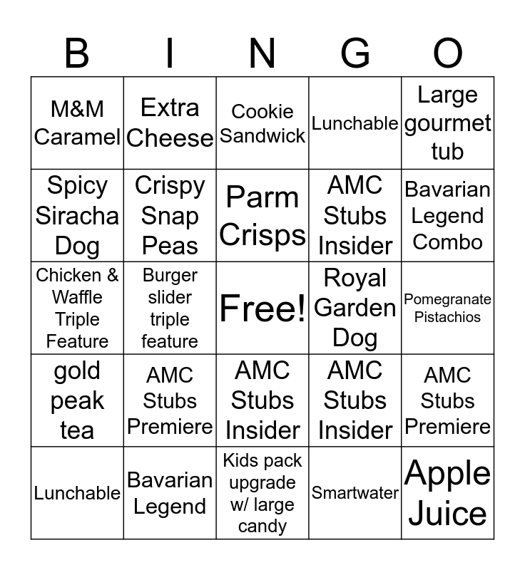 This bingo card has a free space and 24 words: AMC Stubs Premiere, Bavarian Legend, Parm Crisps, Lunchable, Large gourmet tub, M&M Caramel, Spicy Siracha Dog, Extra Cheese, Royal Garden Dog, AMC Stubs Insider, AMC Stubs Insider, Chicken & Waffle Triple Feature, AMC Stubs Insider, AMC Stubs Premiere, Crispy Snap Peas, Smartwater, Pomegranate Pistachios, Cookie Sandwick, Bavarian Legend Combo, Burger slider triple feature, Apple Juice, gold peak tea, Lunchable and Kids pack upgrade w/ large candy.