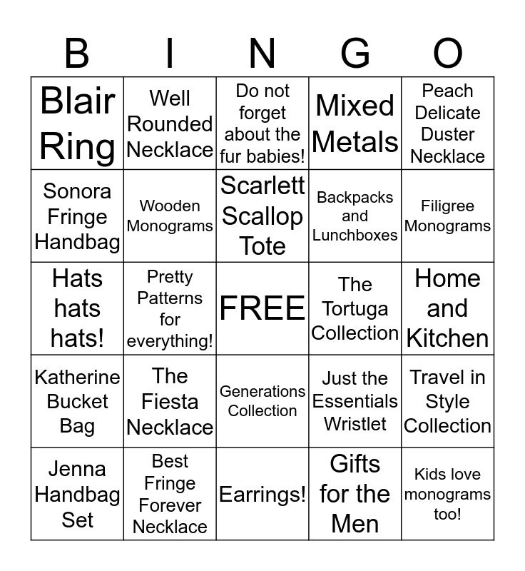 This bingo card has a free space and 24 words: The Fiesta Necklace, Best Fringe Forever Necklace, Scarlett Scallop Tote, Jenna Handbag Set, Peach Delicate Duster Necklace, Blair Ring, Sonora Fringe Handbag, Well Rounded Necklace, The Tortuga Collection, Generations Collection, Backpacks and Lunchboxes, Hats hats hats!, Just the Essentials Wristlet, Travel in Style Collection, Wooden Monograms, Gifts for the Men, Home and Kitchen, Do not forget about the fur babies!, Filigree Monograms, Pretty Patterns for everything!, Kids love monograms too!, Katherine Bucket Bag, Mixed Metals and Earrings!.