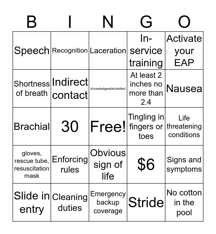 This bingo card has a free space and 24 words: Enforcing rules, Cleaning duties, Knowledgeable/skilled, Slide in entry, Activate your EAP, Speech, Shortness of breath, Recognition, Tingling in fingers or toes, Obvious sign of life, At least 2 inches no more than 2.4, Brachial, $6, Signs and symptoms, Indirect contact, Stride, Life threatening conditions, Laceration, Nausea, 30, No cotton in the pool, gloves, rescue tube, resuscitation mask, In-service training and Emergency backup coverage.