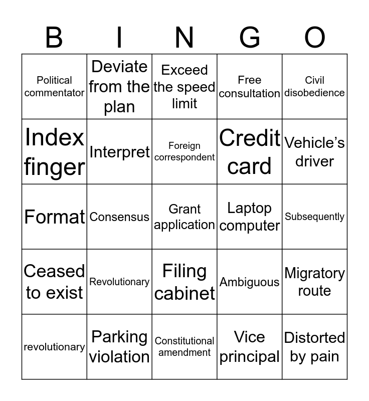 This bingo card has 29 words: revolutionary, Free!, Consensus, Distorted by pain, Political commentator, Exceed the speed limit, Interpret, Revolutionary, Laptop computer, Parking violation, Subsequently, Grant application, Constitutional amendment, Vice principal, Vehicle’s driver, Classic rock, Filing cabinet, Ceased to exist, Civil disobedience, Format, Ambiguous, Secret formula, Credit card, Index finger, Free consultation, Deviate from the plan, Migratory route, Foreign correspondent and Deviant behavior.