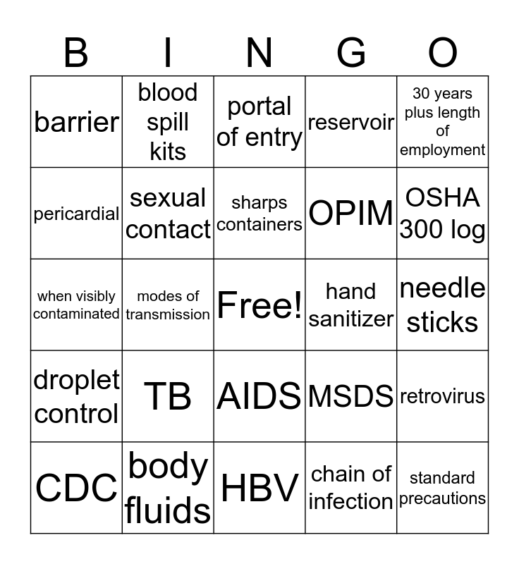 This bingo card has a free space and 24 words: TB, body fluids, sharps containers, CDC, 30 years plus length of employment, barrier, pericardial, blood spill kits, hand sanitizer, AIDS, OPIM, when visibly contaminated, MSDS, retrovirus, sexual contact, chain of infection, needle sticks, portal of entry, OSHA 300 log, modes of transmission, standard precautions, droplet control, reservoir and HBV.