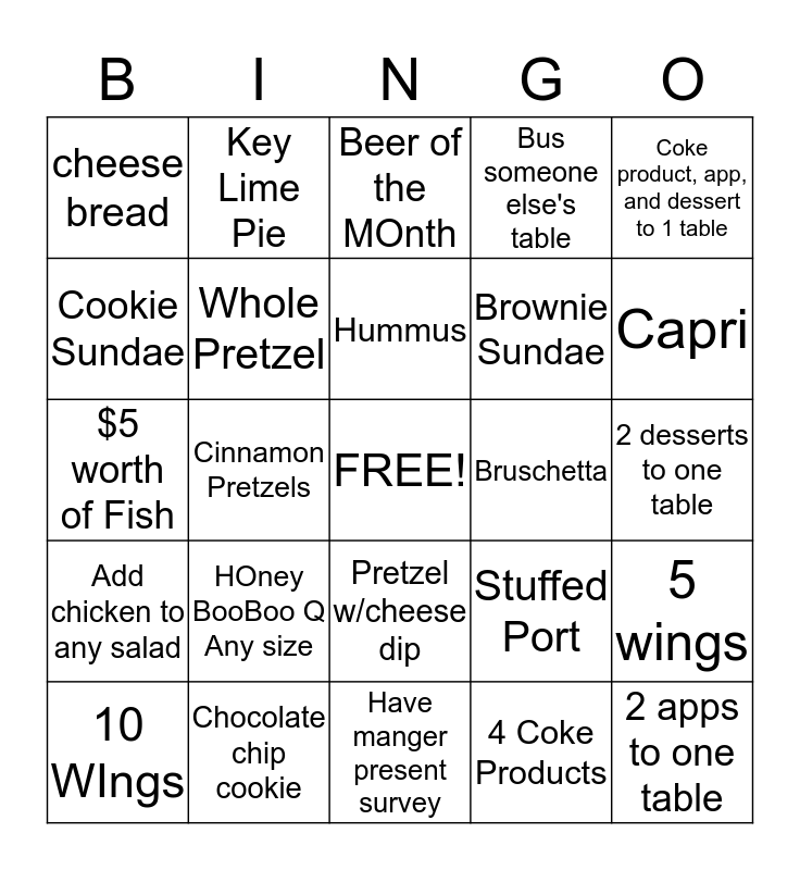 This bingo card has a free space and 24 words: HOney BooBoo Q Any size, Chocolate chip cookie, Hummus, 10 WIngs, Coke product, app, and dessert to 1 table, cheese bread, Cookie Sundae, Key Lime Pie, Bruschetta, Pretzel w/cheese dip, Brownie Sundae, $5 worth of Fish, Stuffed Port, 5 wings, Whole Pretzel, 4 Coke Products, 2 desserts to one table, Beer of the MOnth, Capri, Cinnamon Pretzels, 2 apps to one table, Add chicken to any salad, Bus someone else's table and Have manger present survey.