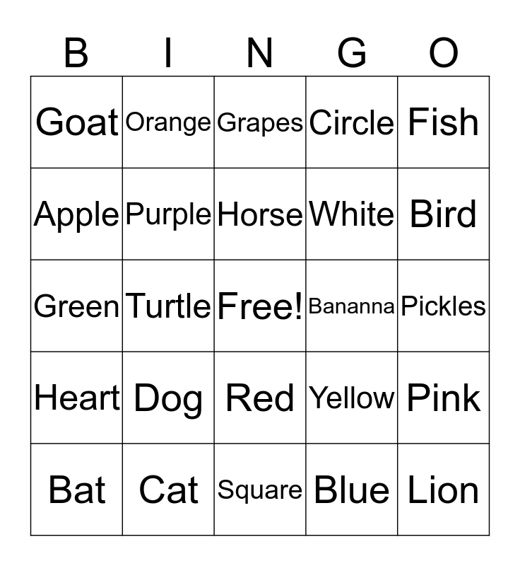 This bingo card has a free space and 24 words: Dog, Cat, Horse, Bat, Fish, Goat, Apple, Orange, Bananna, Red, White, Green, Yellow, Pink, Purple, Blue, Pickles, Grapes, Bird, Turtle, Lion, Heart, Circle and Square.