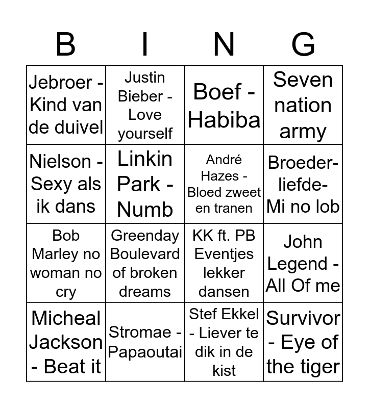 This bingo card has 16 words: Stromae - Papaoutai, John Legend - All Of me, Boef - Habiba, Jebroer - Kind van de duivel, Bob Marley no woman no cry, Justin Bieber - Love yourself, KK ft. PB Eventjes lekker dansen, Stef Ekkel - Liever te dik in de kist, Nielson - Sexy als ik dans, Linkin Park - Numb, Micheal Jackson - Beat it, Seven nation army, Greenday Boulevard of broken dreams, Broeder- liefde- Mi no lob, André Hazes - Bloed zweet en tranen and Survivor - Eye of the tiger.