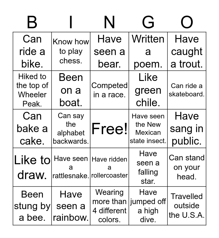 This bingo card has a free space and 24 words: Have seen a rattlesnake., Have seen a rainbow., Competed in a race., Been stung by a bee., Have caught a trout., Can ride a bike., Hiked to the top of Wheeler Peak., Know how to play chess., Have seen the New Mexican state insect., Have ridden a rollercoaster, Like green chile., Can bake a cake., Have seen a falling star., Can stand on your head., Been on a boat., Have jumped off a high dive., Have sang in public., Have seen a bear., Can ride a skateboard., Can say the alphabet backwards., Travelled outside the U.S.A., Like to draw., Written a poem. and Wearing more than 4 different colors..