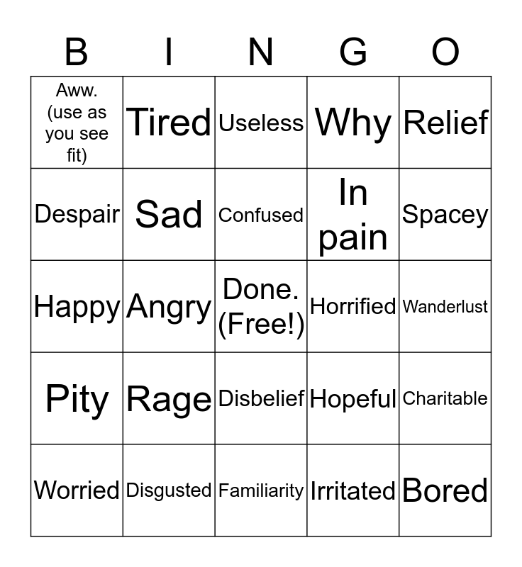 This bingo card has a free space and 24 words: Rage, Disgusted, Confused, Worried, Relief, Aww. (use as you see fit), Despair, Tired, Horrified, Disbelief, In pain, Happy, Hopeful, Charitable, Sad, Irritated, Wanderlust, Useless, Spacey, Angry, Bored, Pity, Why and Familiarity.