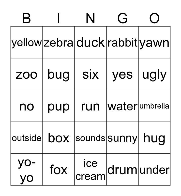 This bingo card has a free space and 24 words: box, fox, six, yo-yo, yawn, yellow, zoo, zebra, water, sounds, yes, no, sunny, hug, bug, drum, umbrella, duck, ugly, pup, under, outside, rabbit and ice cream.