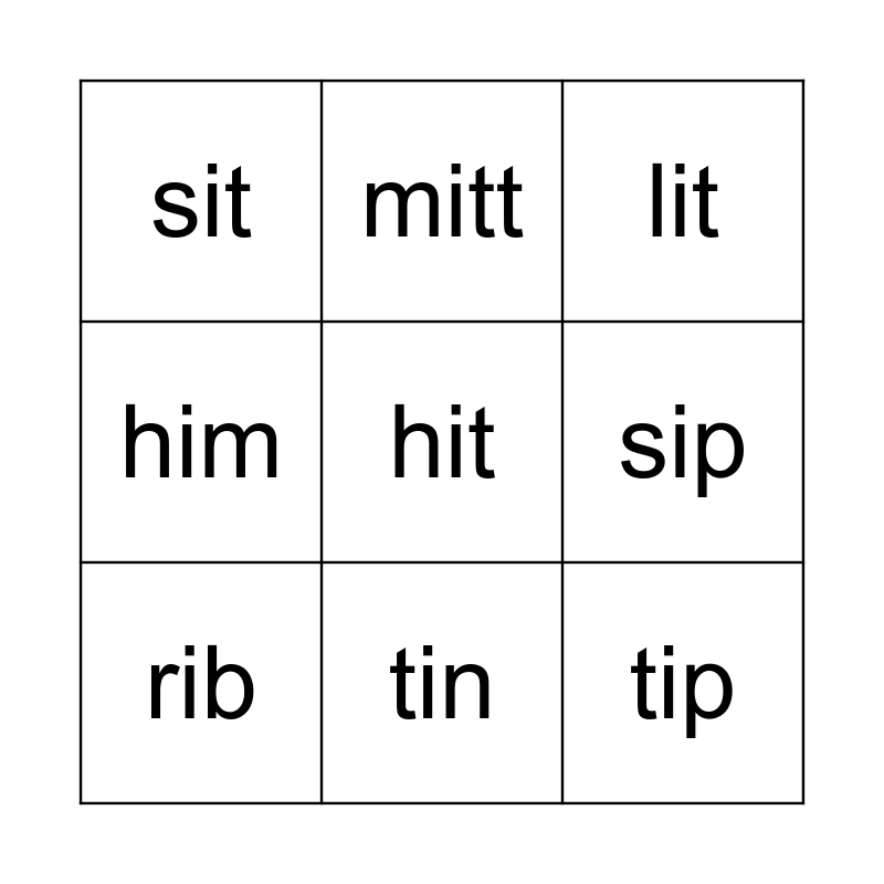 This bingo card has a free space and 8 words: sip, lit, mitt, rib, sit, tip, him and tin.