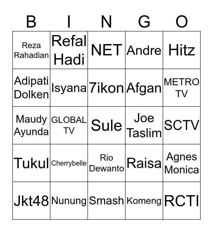 This bingo card has 25 words: Cherrybelle, Smash, 7ikon, Jkt48, Hitz, Reza Rahadian, Adipati Dolken, Refal Hadi, Joe Taslim, Rio Dewanto, Afgan, Maudy Ayunda, Raisa, Agnes Monica, Isyana, RCTI, SCTV, NET, METRO TV, GLOBAL TV, Sule, Nunung, Tukul, Andre and Komeng.