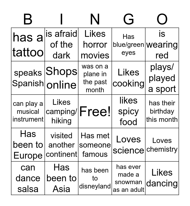 This bingo card has a free space and 34 words: speaks more than one language, has ever made a snowman as an adult, Doesn't like insects, Likes sailing, Has been to Europe, Shops online, is wearing red, can dance salsa, is afraid of the dark, owns more than 30 pairs of shoes, was on a plane in the past month, Likes horror movies, owns a cat, dislikes chocolates, likes spicy food, plays/ played a sport, Has been to Asia, can play a musical instrument, visited another continent, Loves science, Has met someone famous, Is a vegetarian, has a tattoo, has their birthday this month, has been to disneyland, Likes dancing, Has blue/green eyes, doesn't drink coffee, Likes cooking, speaks Spanish, Likes singing, Likes camping/ hiking, Loves chemistry and Loves math.