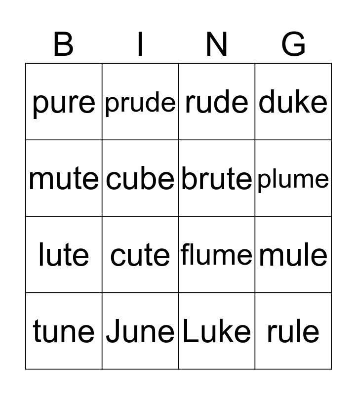 This bingo card has 16 words: tune, June, rude, duke, mute, prude, flume, mule, pure, cube, Luke, plume, lute, cute, brute and rule.