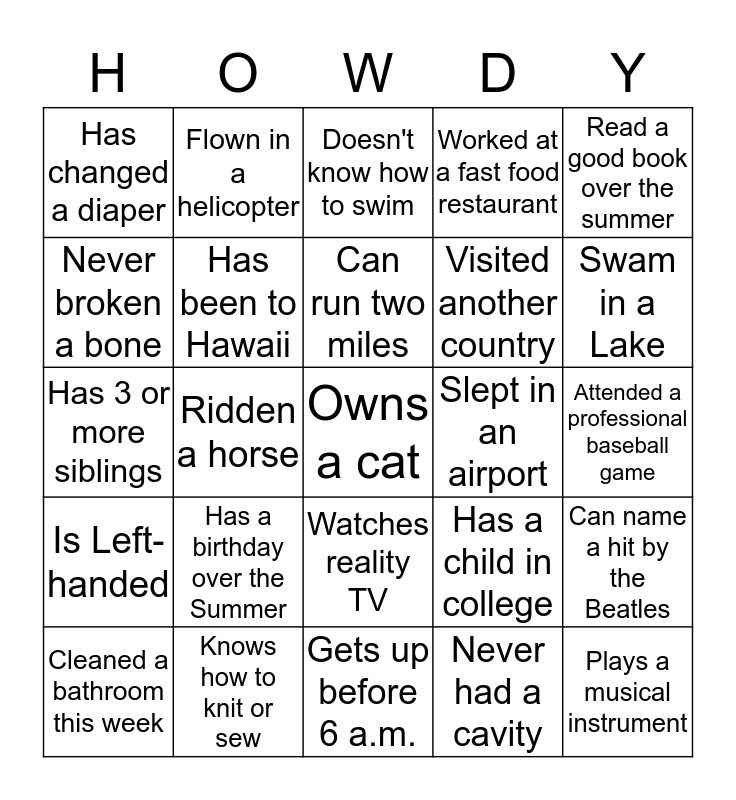 This bingo card has 25 words: Has a birthday over the Summer, Gets up before 6 a.m., Can run two miles, Cleaned a bathroom this week, Read a good book over the summer, Has changed a diaper, Never broken a bone, Flown in a helicopter, Slept in an airport, Watches reality TV, Visited another country, Has 3 or more siblings, Has a child in college, Can name a hit by the Beatles, Has been to Hawaii, Plays a musical instrument, Attended a professional baseball game, Doesn't know how to swim, Swam in a Lake, Ridden a horse, Owns a cat, Knows how to knit or sew, Is Left-handed, Worked at a fast food restaurant and Never had a cavity.