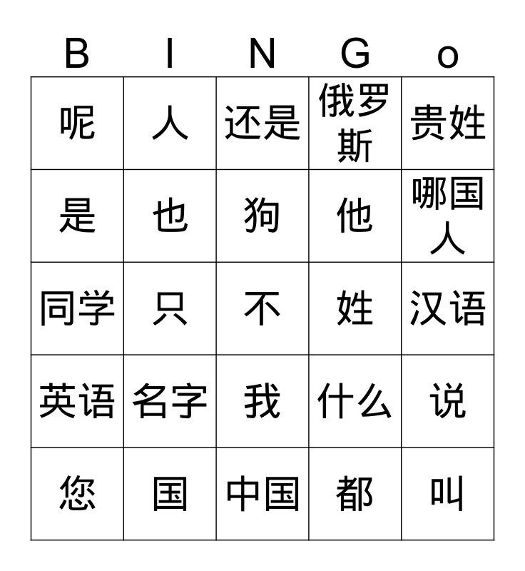 This bingo card has a free space and 24 words: 名字, 国, 狗, 您, 贵姓, 呢, 是, 人, 姓, 我, 他, 同学, 什么, 说, 也, 都, 汉语, 还是, 哪国人, 只, 叫, 英语, 俄罗斯 and 中国.