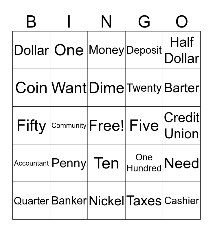 This bingo card has a free space and 25 words: Penny, Nickel, Dime, Quarter, Half Dollar, Dollar, Coin, One, Five, Ten, Twenty, Fifty, One Hundred, Need, Want, Bank, Credit Union, Money, Barter, Community, Cashier, Banker, Accountant, Deposit and Taxes.