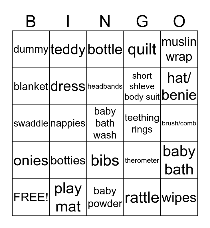 This bingo card has 29 words: FREE!, Mittens, nappies, wipes, dummy, bottle, dress, botties, teething rings, play mat, brush/comb, baby bath wash, baby powder, rattle, hat/ benie, rubber duck, bibs, onies, muslin wrap, swaddle, therometer, singlet, short shleve body suit, blanket, quilt, teddy, baby bath, headbands and socks.
