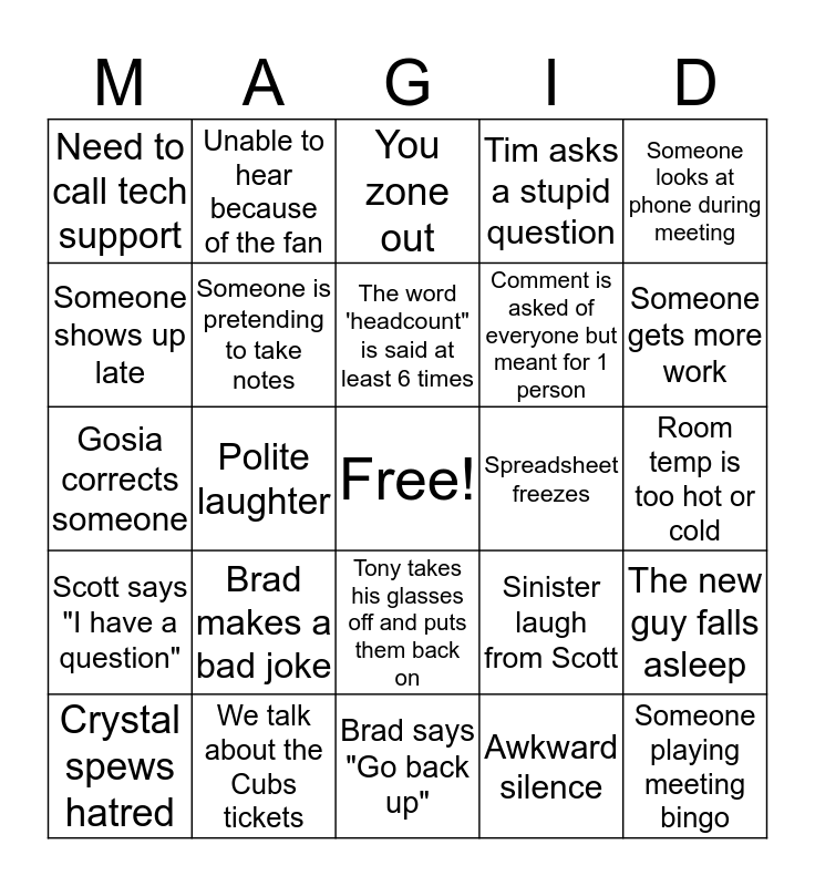This bingo card has a free space and 24 words: Brad makes a bad joke, We talk about the Cubs tickets, The word 'headcount" is said at least 6 times, Crystal spews hatred, Someone looks at phone during meeting, Need to call tech support, Someone shows up late, Unable to hear because of the fan, Spreadsheet freezes, Tony takes his glasses off and puts them back on, Comment is asked of everyone but meant for 1 person, Gosia corrects someone, Sinister laugh from Scott, The new guy falls asleep, Someone is pretending to take notes, Awkward silence, Room temp is too hot or cold, You zone out, Someone gets more work, Polite laughter, Someone playing meeting bingo, Scott says "I have a question", Tim asks a stupid question and Brad says "Go back up".