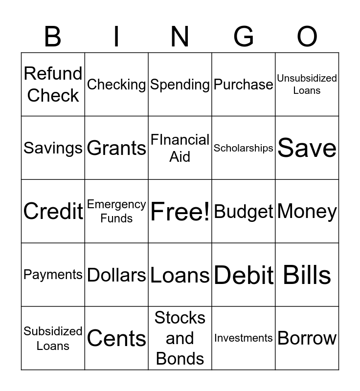 This bingo card has a free space and 24 words: Dollars, Cents, FInancial Aid, Subsidized Loans, Unsubsidized Loans, Refund Check, Savings, Checking, Budget, Loans, Scholarships, Credit, Debit, Bills, Grants, Investments, Money, Spending, Save, Emergency Funds, Borrow, Payments, Purchase and Stocks and Bonds.