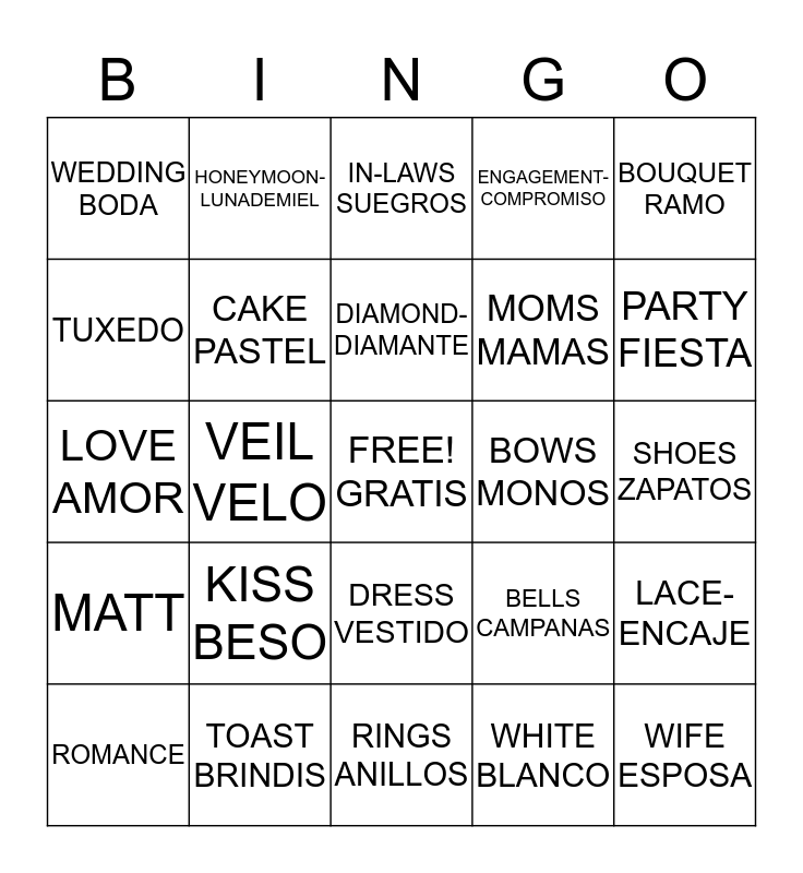 This bingo card has a free space and 29 words: ROMANCE, FOREVER PARA SIEMPRE, VEIL VELO, FLOWERS FLORES, WEDDING BODA, IN-LAWS SUEGROS, CAKE PASTEL, KISS BESO, BOWS MONOS, TOAST BRINDIS, SHOES ZAPATOS, WIFE ESPOSA, RINGS ANILLOS, WHITE BLANCO, PARTY FIESTA, BRIDE NOVIA, DRESS VESTIDO, MATT, BOUQUET RAMO, LOVE AMOR, BELLS CAMPANAS, HUSBAND ESPOSO, MOMS MAMAS, TUXEDO, ENGAGEMENT-COMPROMISO, HONEYMOON-LUNADEMIEL, LACE-ENCAJE, DIAMOND-DIAMANTE and BRENDA.