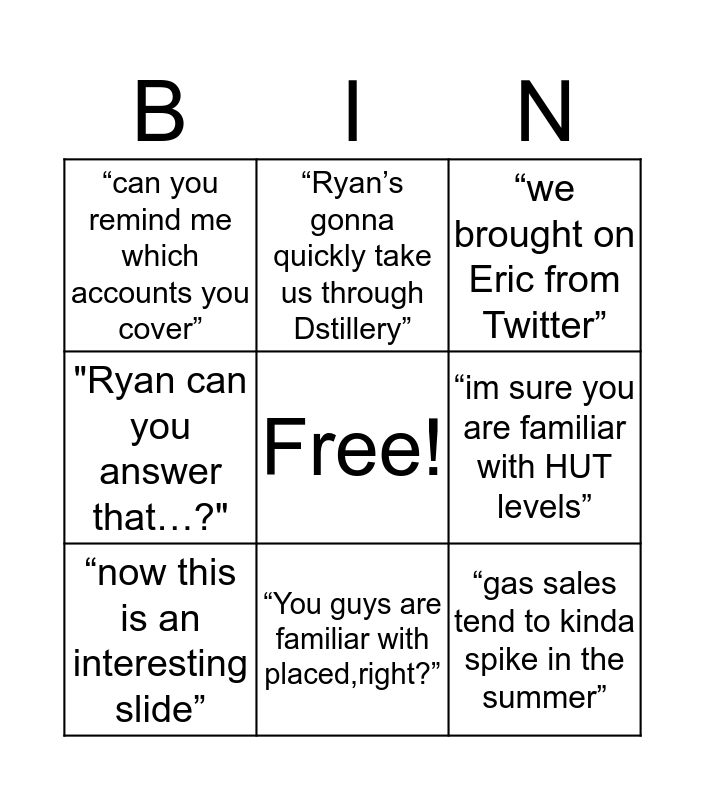 This bingo card has a free space and 12 words: “you guys know this, you read the trades”, “see, TV viewership drops in summer”, “gas sales tend to kinda spike in the summer”, “im sure you are familiar with HUT levels”, “Ryan’s gonna quickly take us through Dstillery”, “we brought on Eric from Twitter”, “You guys are familiar with placed,right?”, “Ryan do you know?”, “can you remind me which accounts you cover”, "Ryan can you answer that…?", “now this is an interesting slide” and "six-foot rubber hose".