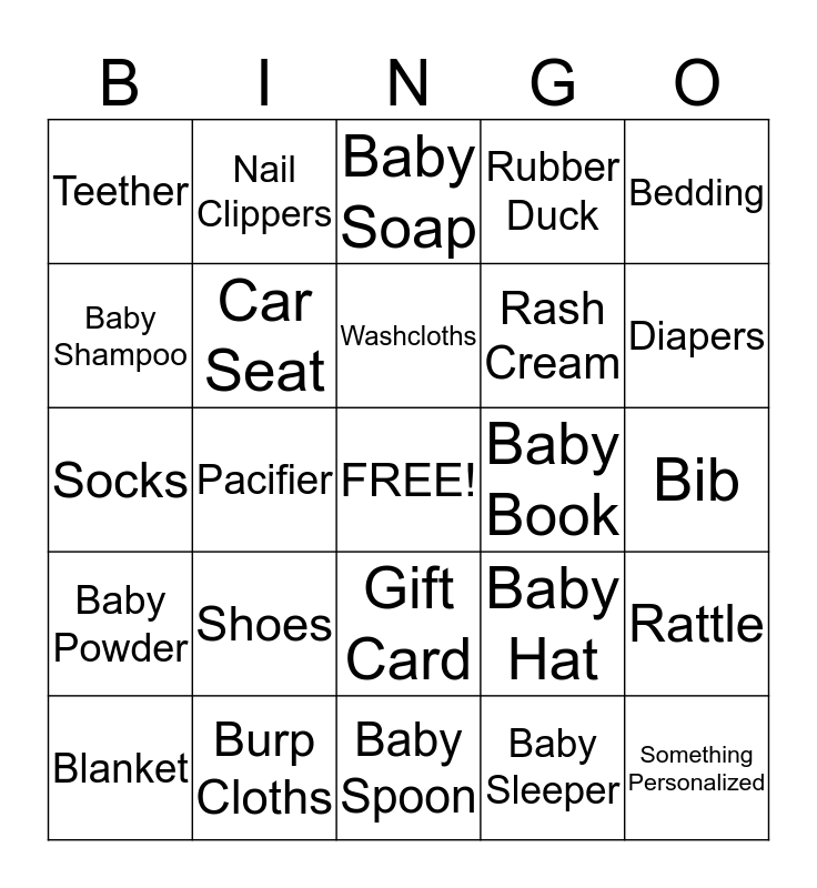 This bingo card has a free space and 33 words: Bottles, Onsie, Pacifier, Baby Lotion, Baby Powder, Car Seat, Bedding, Blanket, Nail Clippers, Hooded Towel, Washcloths, Baby Soap, Bouncer, Stoller, Baby Book, Diapers, Burp Cloths, Socks, Shoes, Baby Hat, Gift Card, Baby Wipes, Teether, Bib, Baby Spoon, Something Personalized, Rubber Duck, Rash Cream, Baby Shampoo, Rattle, Baby Toy, Baby Sleeper and Tub.