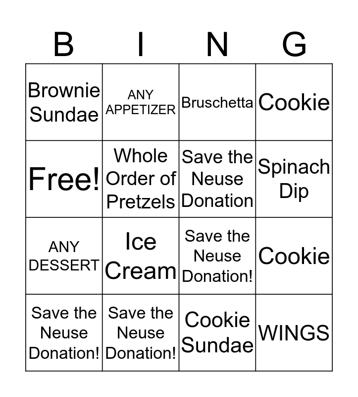 This bingo card has 16 words: Save the Neuse Donation!, Cookie, Bruschetta, Brownie Sundae, ANY DESSERT, ANY APPETIZER, Save the Neuse Donation!, Cookie Sundae, Free!, Whole Order of Pretzels, Save the Neuse Donation!, Cookie, Ice Cream, Spinach Dip, Save the Neuse Donation and WINGS.