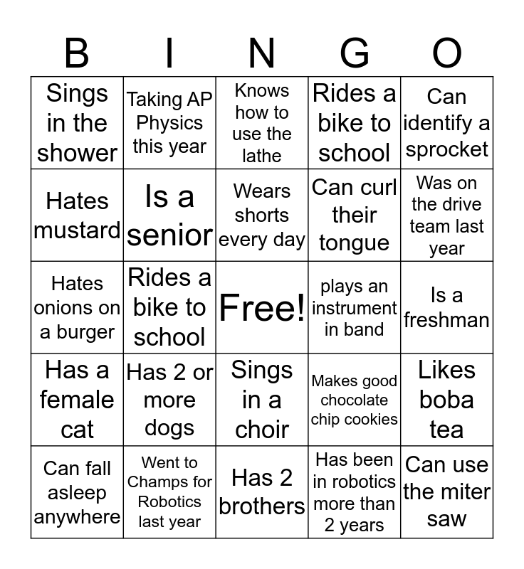 This bingo card has a free space and 24 words: Has 2 or more dogs, Went to Champs for Robotics last year, Wears shorts every day, Can fall asleep anywhere, Can identify a sprocket, Sings in the shower, Hates mustard, Taking AP Physics this year, plays an instrument in band, Sings in a choir, Can curl their tongue, Hates onions on a burger, Makes good chocolate chip cookies, Likes boba tea, Is a senior, Has been in robotics more than 2 years, Is a freshman, Knows how to use the lathe, Was on the drive team last year, Rides a bike to school, Can use the miter saw, Has a female cat, Rides a bike to school and Has 2 brothers.