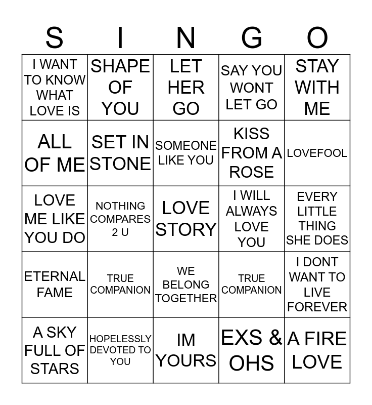 This bingo card has 25 words: TRUE COMPANION, IM YOURS, SOMEONE LIKE YOU, A SKY FULL OF STARS, STAY WITH ME, I WANT TO KNOW WHAT LOVE IS, ALL OF ME, SHAPE OF YOU, I WILL ALWAYS LOVE YOU, WE BELONG TOGETHER, KISS FROM A ROSE, LOVE ME LIKE YOU DO, TRUE COMPANION, I DONT WANT TO LIVE FOREVER, SET IN STONE, A FIRE LOVE, EVERY LITTLE THING SHE DOES, LET HER GO, LOVEFOOL, NOTHING COMPARES 2 U, LOVE STORY, HOPELESSLY DEVOTED TO YOU, ETERNAL FAME, SAY YOU WONT LET GO and EXS & OHS.