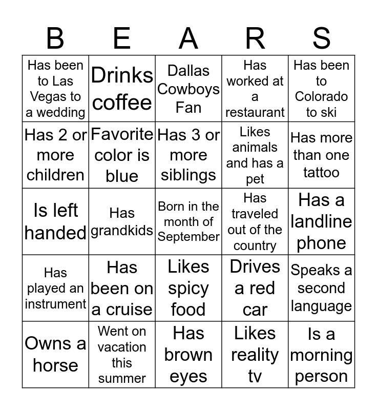 This bingo card has 25 words: Has been on a cruise, Has brown eyes, Has 3 or more siblings, Owns a horse, Has been to Colorado to ski, Has been to Las Vegas to a wedding, Has 2 or more children, Drinks coffee, Has traveled out of the country, Likes spicy food, Likes animals and has a pet, Is left handed, Drives a red car, Speaks a second language, Favorite color is blue, Is a morning person, Has a landline phone, Dallas Cowboys Fan, Has more than one tattoo, Has grandkids, Born in the month of September, Went on vacation this summer, Has played an instrument, Has worked at a restaurant and Likes reality tv.