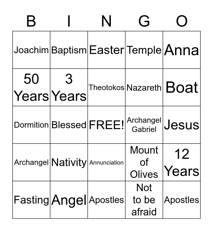 This bingo card has a free space and 24 words: Nativity, Angel, Theotokos, Fasting, Anna, Joachim, 50 Years, Baptism, Archangel Gabriel, Annunciation, Nazareth, Dormition, Mount of Olives, 12 Years, 3 Years, Not to be afraid, Jesus, Easter, Boat, Blessed, Apostles, Archangel, Temple and Apostles.