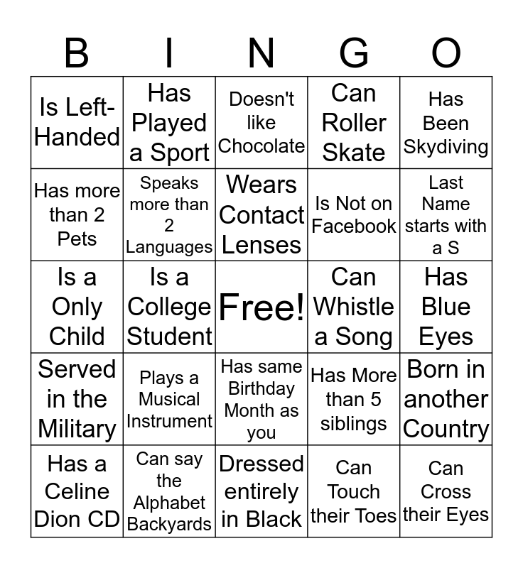 This bingo card has a free space and 40 words: Has Never received a Traffic Ticket, Is a Only Child, Drives a Red Truck/Car, Speaks more than 2 Languages, Can say the Alphabet Backyards, Has same Birthday Month as you, Wears Contact Lenses, Is Wearing Gym Shoes Currently, Has Been Skydiving, Served in the Military, Is a College Student, Can Roller Skate, Can Cross their Eyes, Has Blue Eyes, Can Whistle a Song, Plays a Musical Instrument, Has Been to Europe, Is Left-Handed, Has a Tattoo, Doesn't like Chocolate, Born in another Country, Can Touch their Toes, Is Not on Facebook, Has more than 2 Pets, Can Name all 7 dwarfs, Cuts their own Grass, Has been on a blind date, Votes every election, Shops Online, Still watches Black/White TV Shows, Doesn't Drink Coffee, Has a Celine Dion CD, Has Served on a Jury, Has More than 5 siblings, Last Name starts with a S, Dressed entirely in Black, 4 or more piercings in one ear, Is Younger than you, Has Played a Sport and Is a Grandparent.