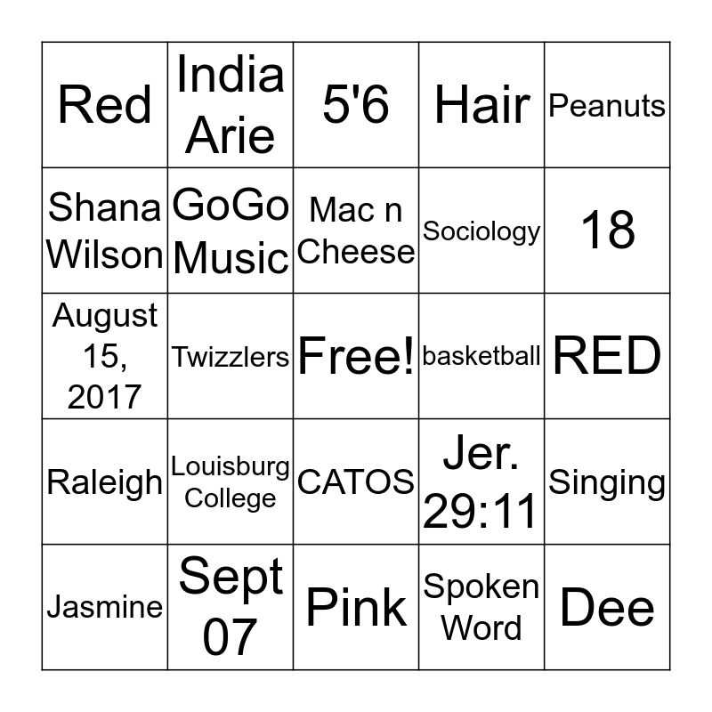 This bingo card has a free space and 24 words: Jasmine, Louisburg College, Mac n Cheese, Spoken Word, Peanuts, Red, India Arie, 5'6, basketball, RED, August 15, 2017, GoGo Music, Jer. 29:11, Singing, Shana Wilson, Sept 07, Pink, Hair, 18, Raleigh, Twizzlers, CATOS, Sociology and Dee.