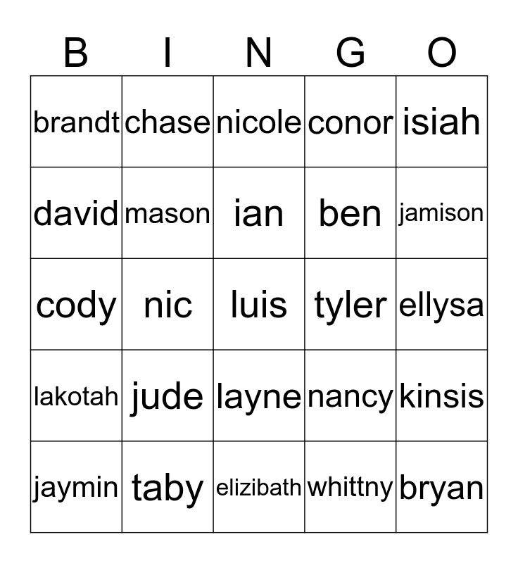 This bingo card has a free space and 24 words: jude, taby, ian, jaymin, isiah, brandt, david, chase, tyler, layne, ben, cody, nancy, kinsis, mason, whittny, ellysa, nicole, jamison, nic, bryan, lakotah, conor and elizibath.
