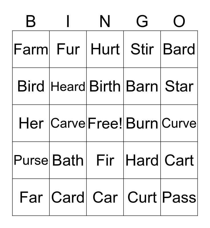 This bingo card has a free space and 24 words: Bath, Card, Birth, Far, Bard, Farm, Bird, Fur, Burn, Fir, Barn, Her, Hard, Cart, Heard, Curt, Curve, Hurt, Star, Carve, Pass, Purse, Stir and Car.