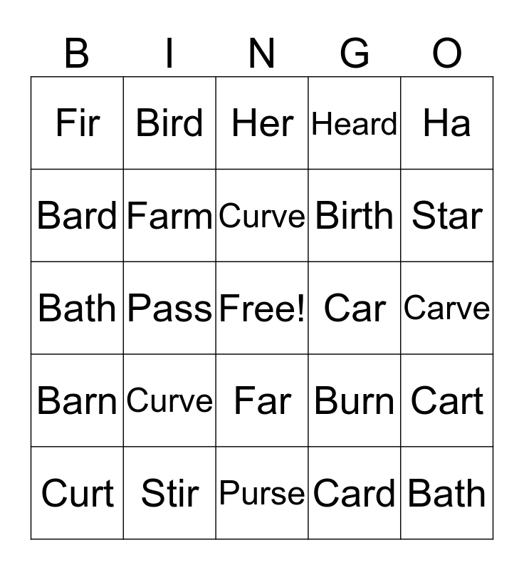 This bingo card has a free space and 24 words: Curve, Stir, Curve, Curt, Ha, Fir, Bard, Bird, Car, Far, Birth, Bath, Burn, Cart, Farm, Card, Carve, Her, Star, Pass, Bath, Barn, Heard and Purse.